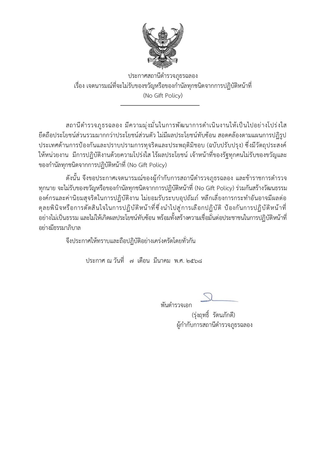 ผู้บังคับบัญชา สภ.ฉลอง ร่วมปล่อยแถวเคารพธงชาติ และประกาศเจตนารมณ์ต่อต้านการรับสินบน